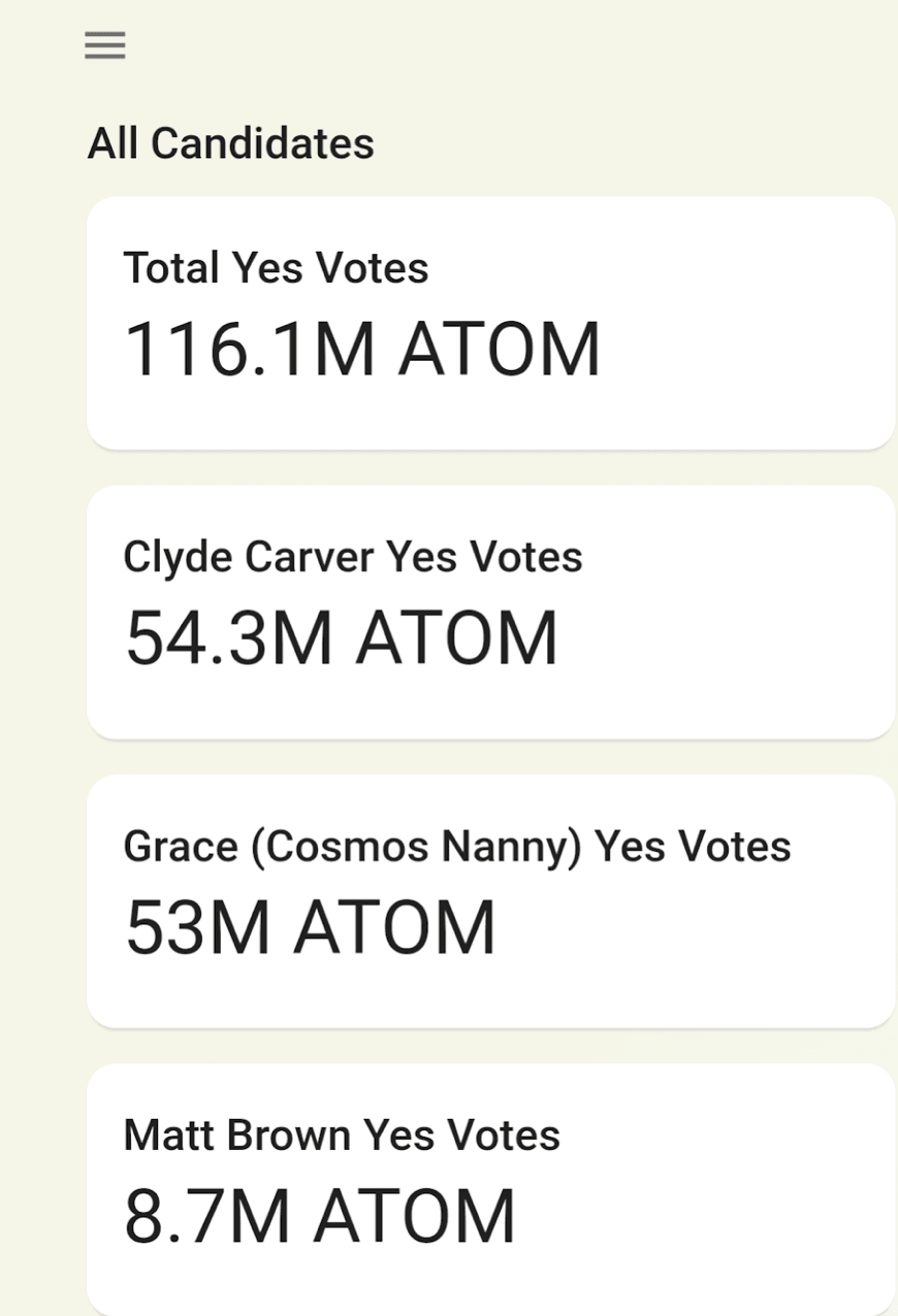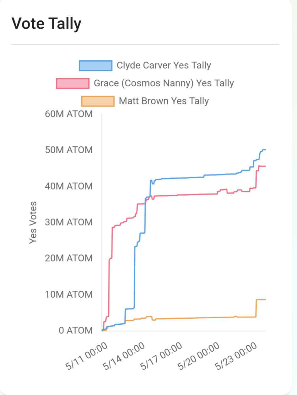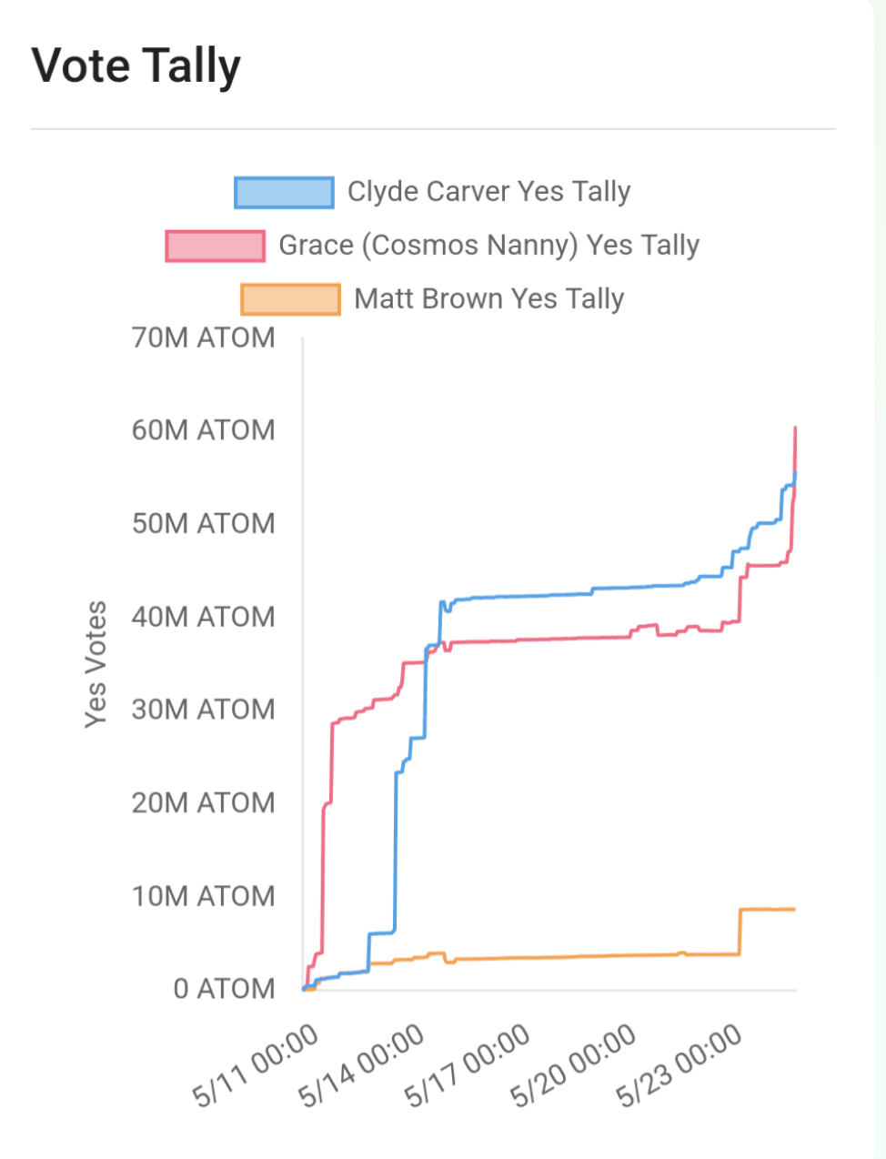 On May 24th, Grace won with 5,439,569 more ATOMs than Clyde, a 9.8% advantage.
