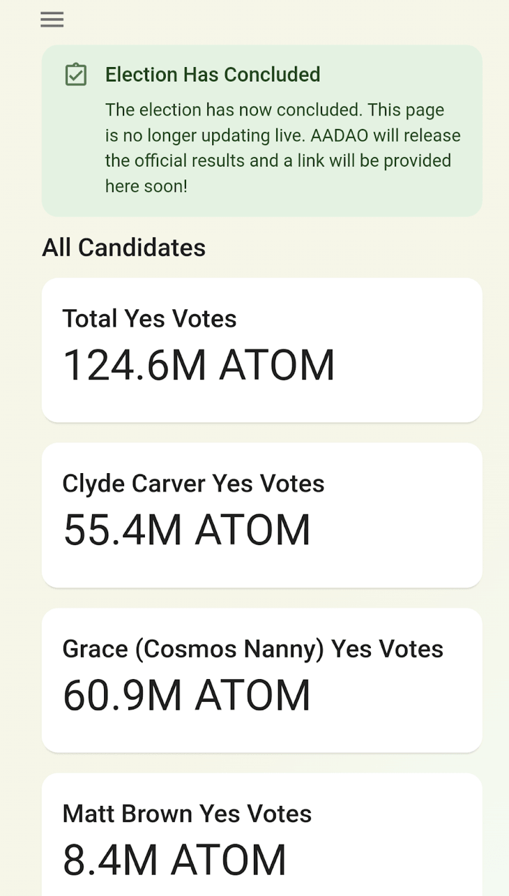 - Results of the first Cosmos Hub Governance election, which elected Grace Yu to the AADAO Oversight Committee; including appointment details and early actions of the elected member.